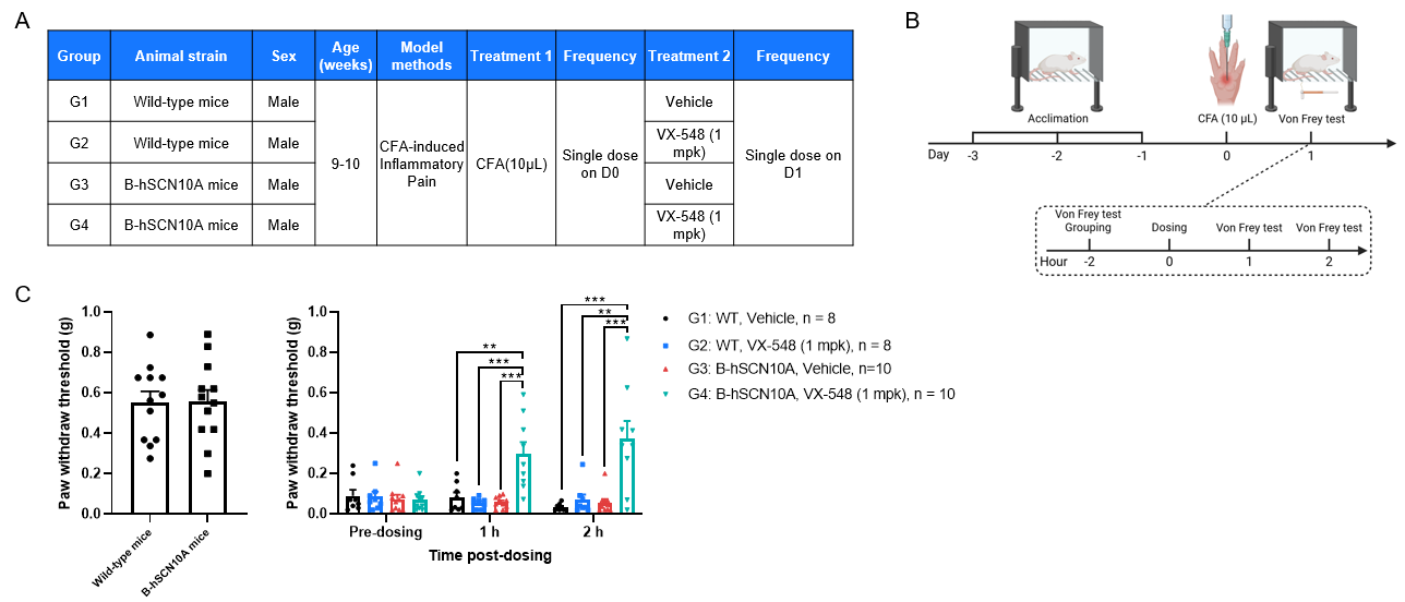 CFA-induced inflammatory pain and analgesic effects of VX-548 in wild-type mice and B-hSCN10A mice. The mechanical pain thresholds in B-hSCN10A mice were similar to those in the wild-type mice. In wild-type mice and B-hSCN10A mice, CFA injection markedly reduced mechanical pain thresholds. In wild-type mice, VX-548 at 1 mpk didn’t alleviate CFA-induced inflammatory pain. In B-hSCN10A mice, VX-548 at 1 mpk significantly alleviated inflammatory pain with an analgesic effect lasting up to 2 h. B-hSCN10A mice provide a powerful preclinical model for in vivo evaluation of the efficacy of targeted human SCN10A analgesic drugs. (A) Grouping and Treatment. (B) The schematic diagram of CFA-induced inflammatory pain modeling. (C) Analgesic effect of VX-548. **P < 0.01, ***P < 0.001.