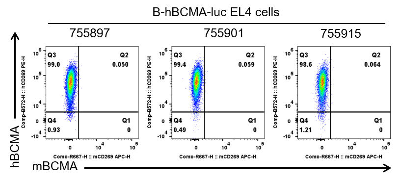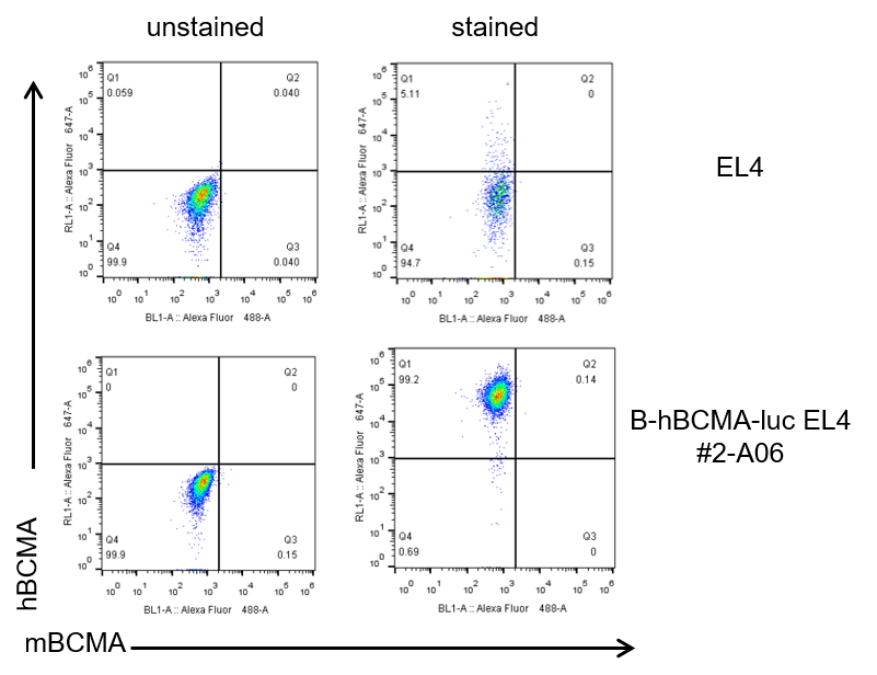 BCMA expression evaluated on B-hBCMA-luc EL4 cells by flow cytometry. B-hBCMA-luc EL4 cells (1×106) were subcutaneously implanted into C57BL/6 mice (female, 6-week-old, n=6). Upon conclusion of the experiment, tumor cells were harvested and assessed for human BCMA expression (BioLegend, 357504) and mouse BCMA (Miltenyi biotec, 130-122-954) by flow cytometry. As shown, human BCMA was highly expressed on the surface of tumor cells, whereas mouse BCMA was not detected, indicating that either the antibody was non-reactive or mouse BCMA was not expressed. Therefore, B‑hBCMA‑Luc EL4 cells are suitable for in vivo efficacy studies evaluating novel BCMA-targeted therapies.