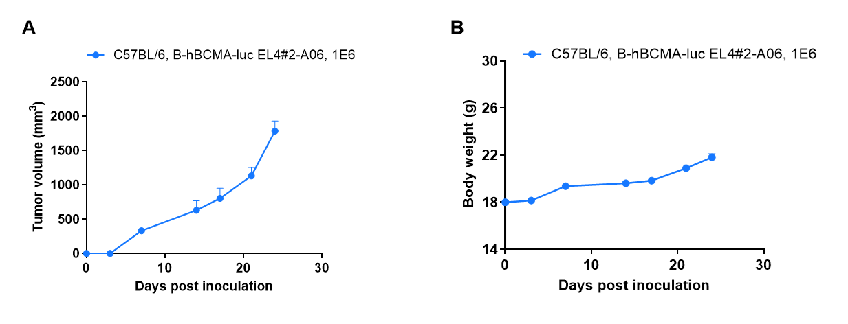 Subcutaneous homograft tumor growth of B-hBCMA-luc EL4 cells. B-hBCMA-luc EL4 cells (1×106) were subcutaneously implanted into C57BL/6 mice (female, 6-week-old, n=6). Tumor volume and body weight were measured twice a week. (A) Average tumor volume ± SEM. (B) Body weight (Mean± SEM). Volume was expressed in mm3 using the formula: V=0.5 × long diameter × short diameter2. As shown in panel A, B-hBCMA-luc EL4 cells were able to establish tumors in vivo and can be used for efficacy studies.
