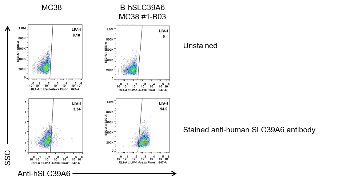 SLC39A6 expression analysis in B-hSLC39A6 MC38 cells by flow cytometry. Single cell suspensions from wild-type MC38 and B-hSLC39A6 MC38 cultures were stained with anti-human SLC39A6 antibody (in-house). Human SLC39A6 was detected on the surface of B-hSLC39A6 MC38 cells but not on wild-type MC38 cells. The 1-B03 clone of B-hSLC39A6 MC38 cells was used for in vivo experiments.