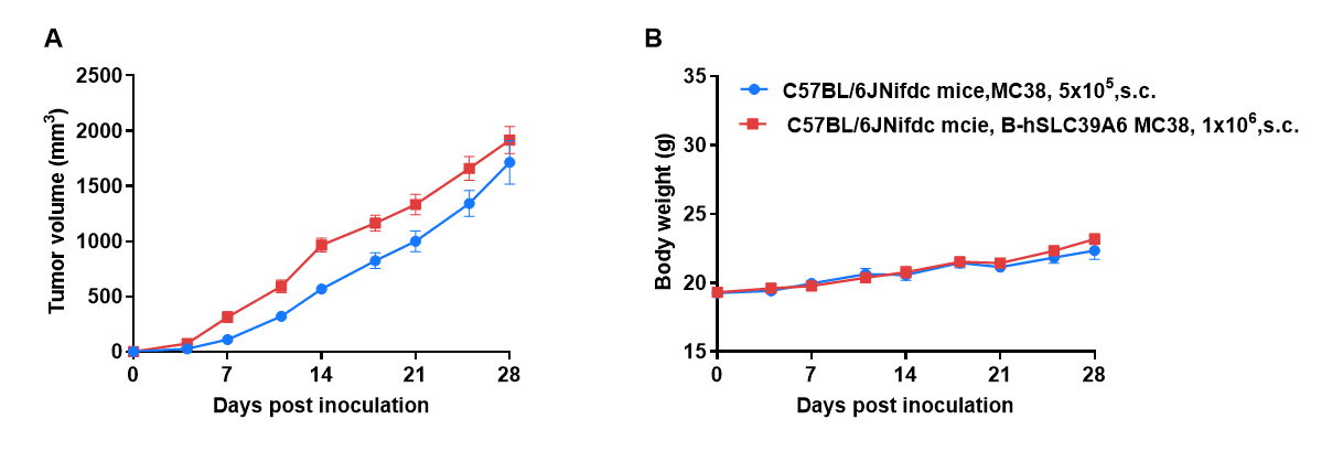 Subcutaneous homograft tumor growth of B-hSLC39A6 MC38 cells. B-hSLC39A6 MC38 (1x106) and wild-type MC38 cells (5x105) were subcutaneously implanted into C57BL/6JNifdc mice (female, 8-week-old, n=6). Tumor volume and body weight were measured twice a week. (A) Average tumor volume ± SEM. (B) Body weight (Mean± SEM). Volume was expressed in mm3 using the formula: V=0.5 X long diameter X short diameter2. As shown in panel A, B-hSLC39A6 MC38 were able to establish tumors in vivo and can be used for efficacy studies.