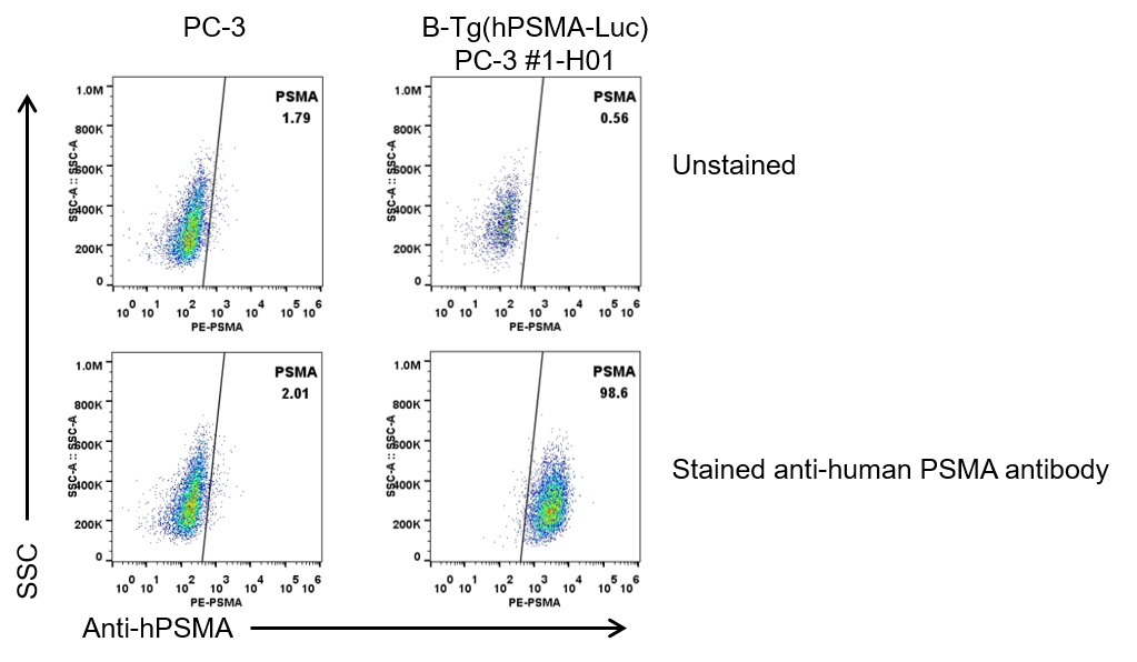 • Gene targeting strategy: The expression cassette containing the human CDS for PSMA, and luciferase was randomly inserted into the genome B-Tg(hPSMA-Luc) PC-3.