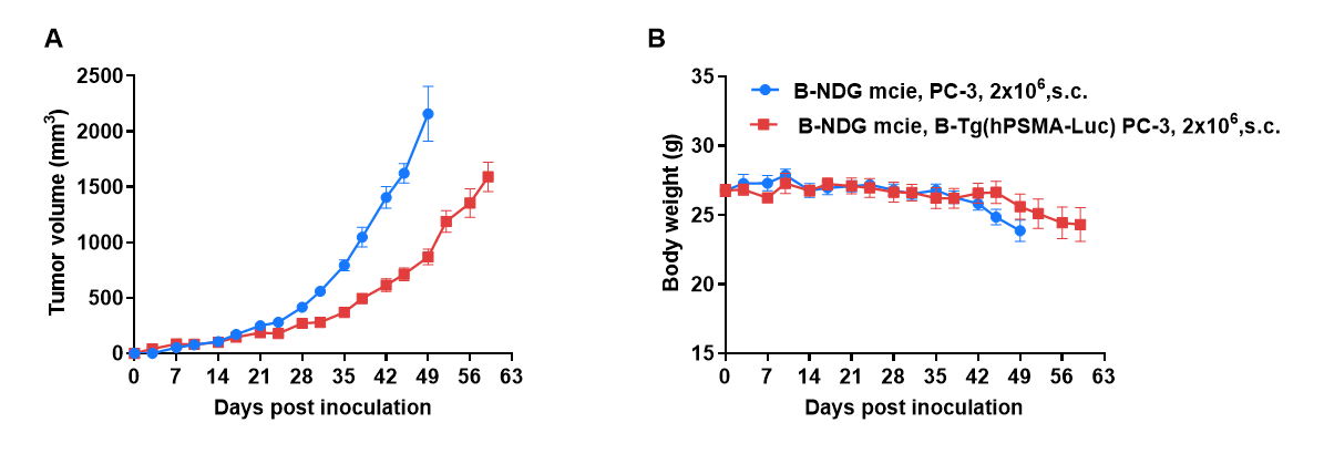 • Application: The B-Tg(hPSMA-Luc) PC-3 tumor models can be used for preclinical evaluation of monoclonal antibody drugs targeting human PSMA.
