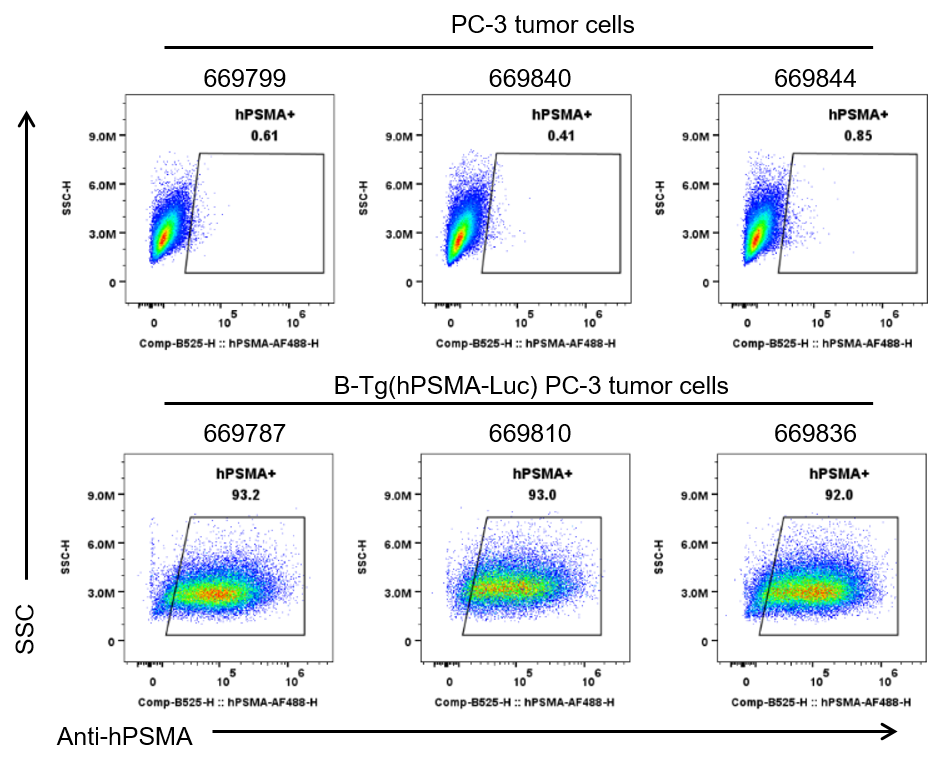 B-Tg(hPSMA-Luc) PC-3 cells were subcutaneously transplanted into B-NDG mice (female, 7-week-old, n=6), and on 59 days post inoculation, tumor cells were harvested and assessed for human PSMA expression with anti-human PSMA (Biolegend, 342506) antibody by flow cytometry. As shown, human PSMA was highly expressed on the surface of tumor cells. Therefore, B-Tg(hPSMA-Luc) PC-3 cells can be used for in vivo efficacy studies of novel PSMA therapeutics.