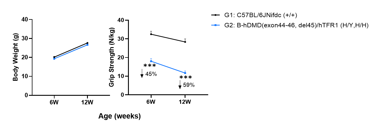 Behavioral performance in wild-type C57BL/6JNifdc and homozygous B-hDMD(exon44-46, del45)/hTFR1 mice. Grip strength tests were conducted to assay the behavioral performance in wild-type C57BL/6JNifdc and homozygous B-hDMD(exon44-46, del45)/hTFR1 mice (male, 6 and 12-week-old, n=12). Grip strength produced by forelimb in homozygous B-hDMD(exon44-46, del45)/hTFR1 mice was significant weaker than that in wild-type control mice. All grip strength measurements are normalized to the individual animal’s body weight. Values are expressed as mean ± SEM. At each time point significance was determined by unpaired t test. *P < 0.05, **P < 0.01, ***P < 0.001.