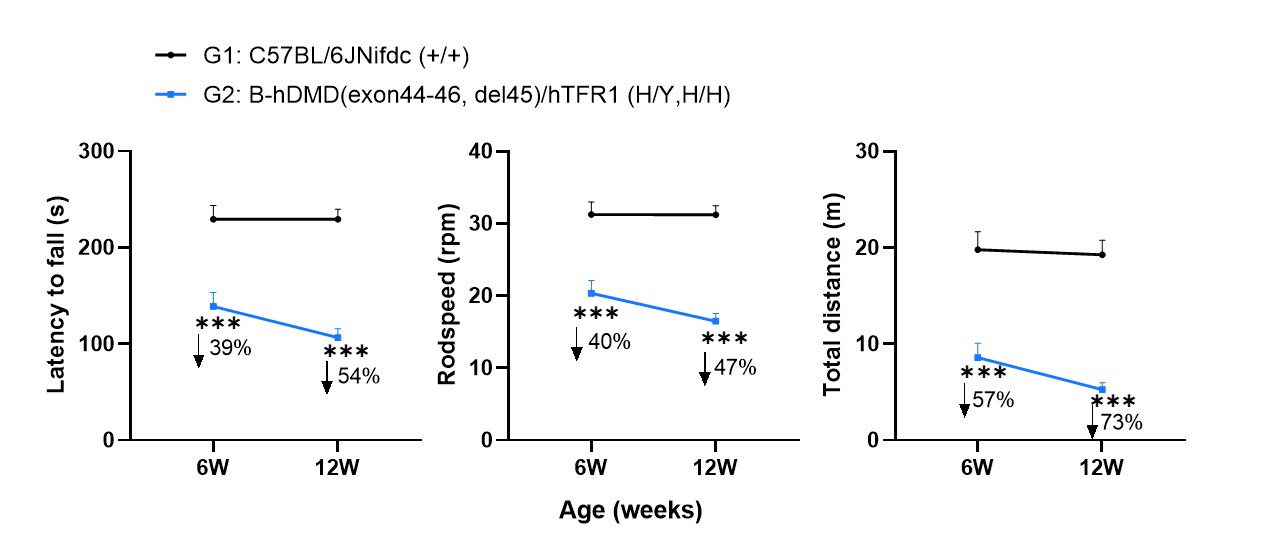 Behavioral performance in wild-type C57BL/6JNifdc and homozygous B-hDMD(exon44-46, del45)/hTFR1 mice. Rotarod tests were conducted to assay the behavioral performance in wild-type C57BL/6JNifdc and homozygous B-hDMD(exon44-46, del45)/hTFR1 mice (male, 6, 12-week-old, n=12). Rotarod tests were performed to assay the motor coordination. The latency to fall, rodspeed and total distance were significantly decreased in homozygous B-hDMD(exon44-46, del45)/hTFR1 mice, showing the impairment of motor coordination and balance. Values are expressed as mean ± SEM. At each time point significance was determined by unpaired t test. *P < 0.05, **P < 0.01, ***P < 0.001.
