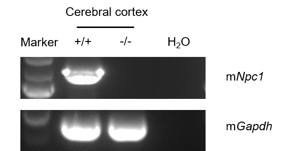 Strain specific analysis of Npc1 mRNA expression in wild-type BALB/cCrSlcNifdc and B-Npc1 KO mice(C) by RT-PCR. Cerebral cortex RNA was isolated from wild-type BALB/cCrSlcNifdc (+/+) and homozygous B-Npc1 KO mice(C) (-/-), then cDNA libraries were synthesized by reverse transcription, followed by PCR with mouse Npc1 primers. Mouse Npc1 mRNA was exclusively detectable in BALB/cCrSlcNifdc but not in B-Npc1 KO mice(C).