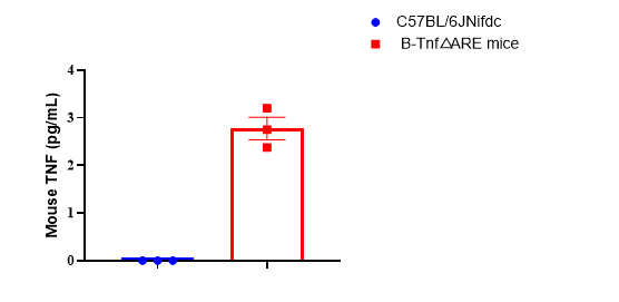• Under SPF housing conditions, the serum TNF protein level in B-Tnf△ARE mice is relatively low, at approximately 3 pg/mL, whereas no expression is detectable in wild‑type mice.