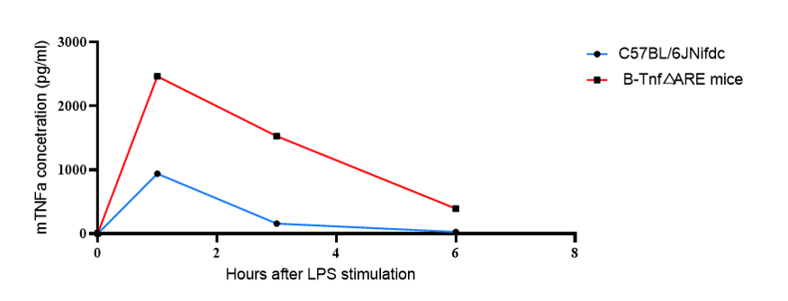 • In B-Tnf△ARE mice, the deletion of this ARE sequence enhances the stability of Tnfα mRNA, leading to chronically elevated levels of TNF protein.