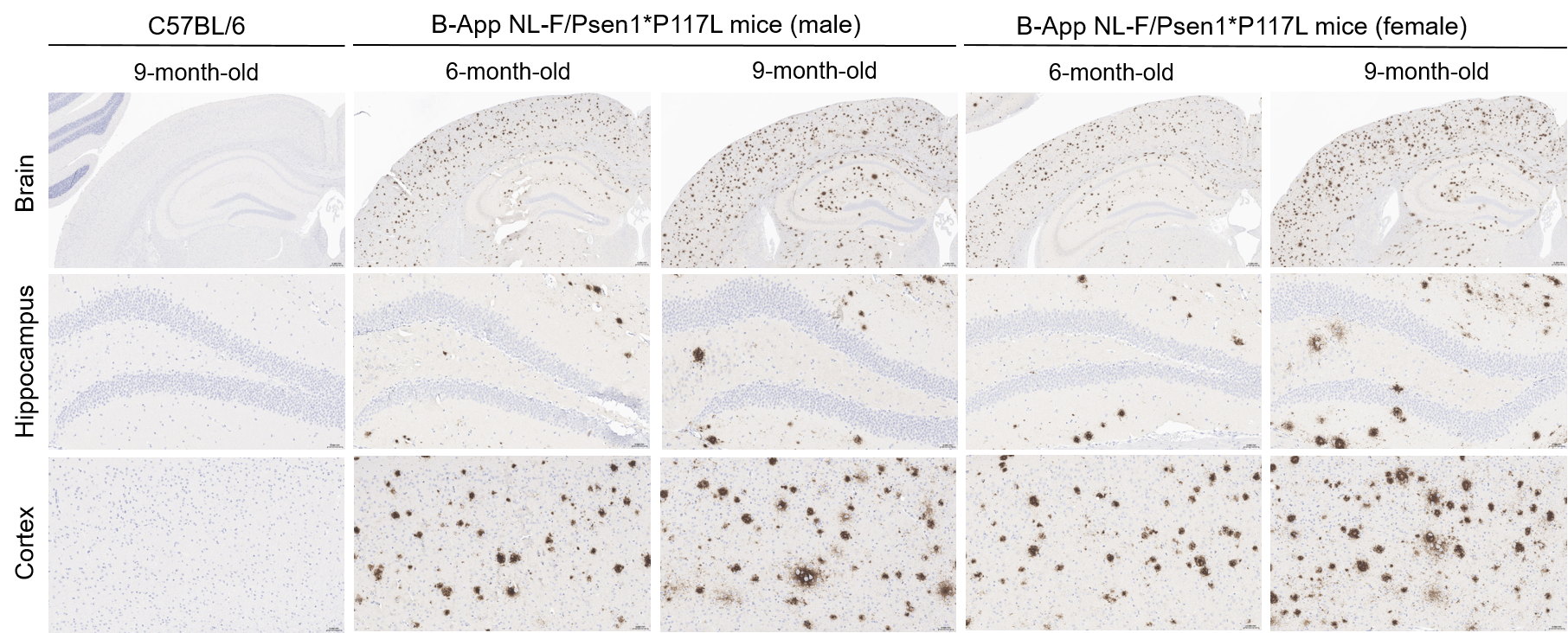 • Immunohistochemistry analysis: The Aβ plaques was exclusively detectable in homozygous B-App NL-F/Psen1*P117L mice, but not in wild-type mice. Compared to wild-type mice, the number of activated astrocytes and microglia cells in the cortex and hippocampus significantly increases, indicating the presence of inflammation in the brain.