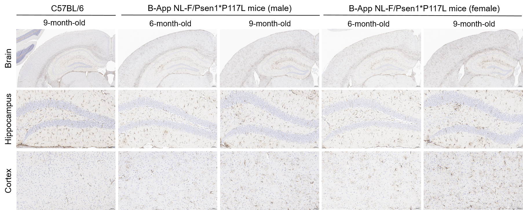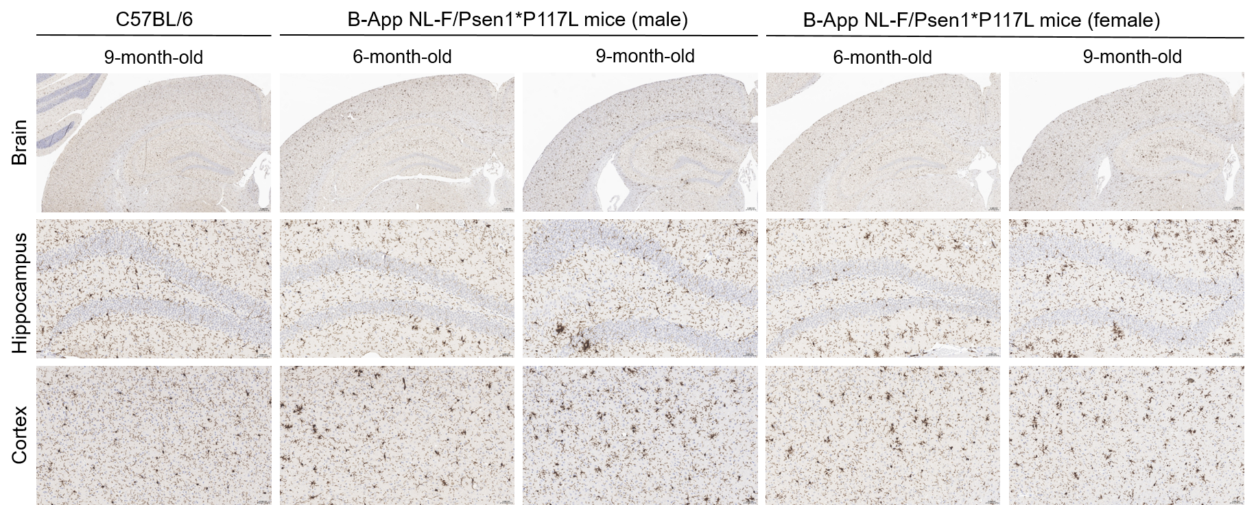 Histopathological analysis  of microglia cells in homozygous B-App NL-F/Psen1*P117L mice. Brain was collected from wild-type mice (9-month-old) and homozygous B-App NL-F/Psen1*P117L mice (6-month-old and 9-month-old) and processed into paraffin sections. The expression of Iba1 in the cortex and hippocampus of C57BL/6 mice and B-App NL-F/Psen1*P117L mice was detected by IHC with anti-Iba1 antibody (abcam, ab178846). Compared to wild-type mice, the number of activated microglia cells in the cortex and hippocampus of homozygous B-App NL-F/Psen1*P117L mice was increased in an age-dependent manner. Scale bar: 50 μm.