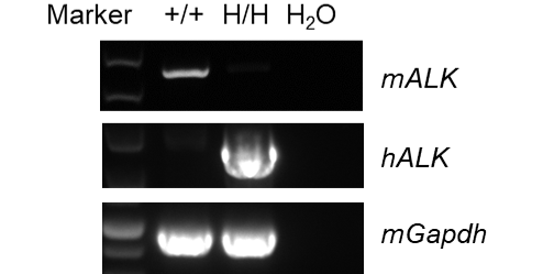 Strain specific analysis of ALK mRNA expression in wild-type C57BL/6 mice and B-hALK mice by RT-PCR. Brain RNA were isolated from wild-type C57BL/6 mice (+/+) and homozygous B-hALK mice (H/H), then cDNA libraries were synthesized by reverse transcription, followed by PCR with mouse or human ALK primers. Mouse Alk mRNA was detectable in wild-type mice. Human ALK mRNA was detectable only in homozygous B-hALK mice but not in wild-type mice.