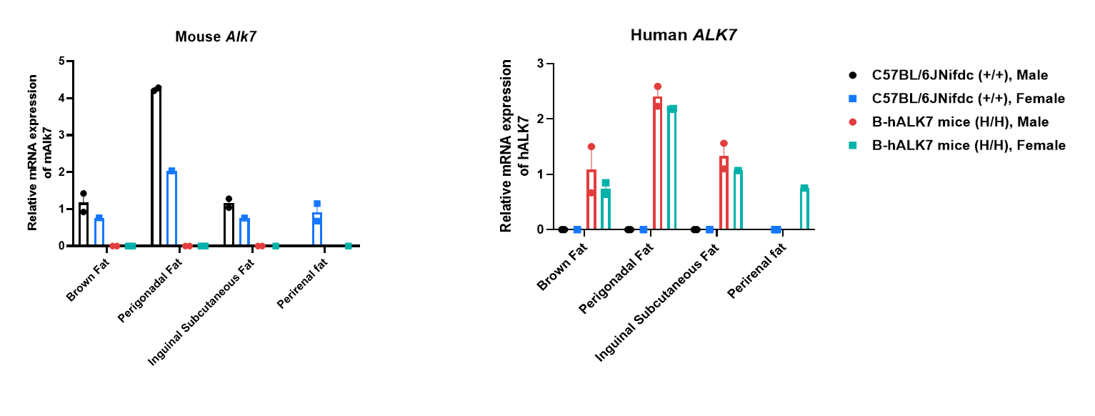 Strain specific analysis of ALK7 mRNA expression in wild-type C57BL/6JNifdc mice and B-hALK7 mice by RT-qPCR. Perirenal fat, perigonadal fat, inguinal subcutaneous fat, and brown fat RNA were isolated from wild-type C57BL/6JNifdc mice (+/+) and homozygous B-hALK7 mice (H/H), then cDNA libraries were synthesized by reverse transcription, followed by RT-qPCR with mouse or human ALK7 primers. Human ALK7 mRNA was exclusively detectable in B-hALK7 mice but not in wild-type mice. Note: The male perirenal fat was not collected.