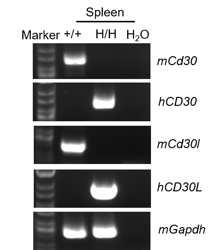 Species specific analysis of CD30 and CD30L gene expression in wild-type C57BL/6JNifdc mice and homozygous B-hCD30/hCD30L mice by RT-PCR. Spleen was collected from wild-type C57BL/6JNifdc mice (+/+) and homozygous B-hCD30/hCD30L mice (H/H;H/H). Mouse Cd30 and Cd30l mRNA were detectable in wild-type C57BL/6JNifdc mice. Human CD30 and CD30L mRNA were detectable only in homozygous B-hCD30/hCD30L mice, but not in wild-type C57BL/6JNifdc mice.