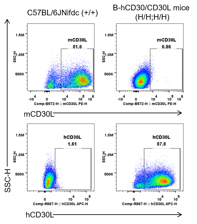 Strain specific CD30L expression analysis in wild-type C57BL/6JNifdc mice and homozygous B-hCD30/hCD30L mice by flow cytometry. Splenocytes were collected from wild-type C57BL/6JNifdc mice (+/+) and homozygous B-hCD30/hCD30L mice (H/H;H/H). Splenocytes were incubated in a medium containing Cell Activation Cocktail (without Brefeldin A) in vitro for 20 h, protein expression was analyzed with anti-mouse CD30L antibody (Biolegend, 106405) and anti-human CD30L antibody (RD, FAB1028A) by flow cytometry. Mouse CD30L was detectable in wild-type C57BL/6JNifdc mice. Human CD30L was detectable in homozygous B-hCD30/hCD30L mice.