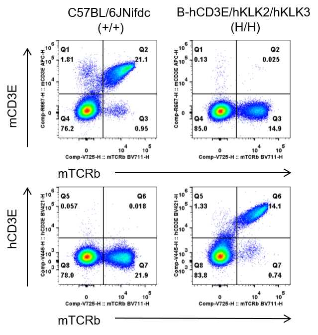 • Mouse CD3E was detectable on T cells of wild-type C57BL/6JNifdc mice. Human CD3E was exclusively detectable on T cells of  homozygous B-hCD3E/hKLK2/hKLK3 mice but not on wild-type mice.
