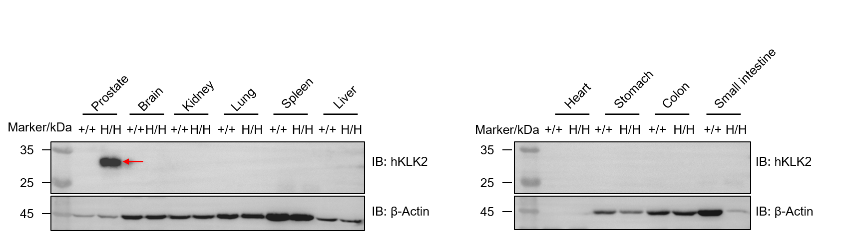 Western blot analysis of KLK2 protein expression in homozygous B-hCD3E/hKLK2/hKLK3 mice. Various tissue lysates were collected from wild-type C57BL/6JNifdc mice (+/+) and homozygous B-hCD3E/hKLK2/hKLK3 mice (H/H), and then analyzed by western blot with anti-KLK2 antibody(LSbio, LS-C336461). 40 μg total proteins were loaded for western blotting analysis. KLK2 was detected in prostate of homozygous B-hCD3E/hKLK2/hKLK3 mice.