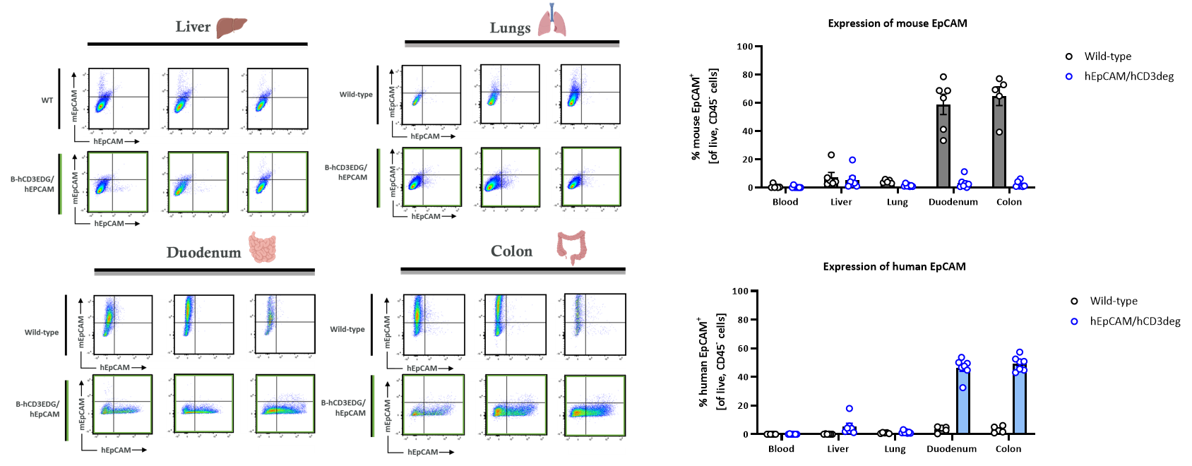 Tissue-specific expression of human and mouse EPCAM was assessed by flow cytometry in wild-type C57BL/6 mice and homozygous B-hCD3EDG/hEPCAM mice. Analysis revealed that human EpCAM is predominantly localized to the colon and duodenum, mirroring the endogenous expression pattern of mouse EpCAM. Expression levels were significantly higher in the gastrointestinal tract compared to the lung or liver. These findings demonstrate that human EpCAM expression in the B-hCD3EDG/hEPCAM model is tissue-restricted rather than systemic (The data was provided by client). Illustrations were created with BioRender.com