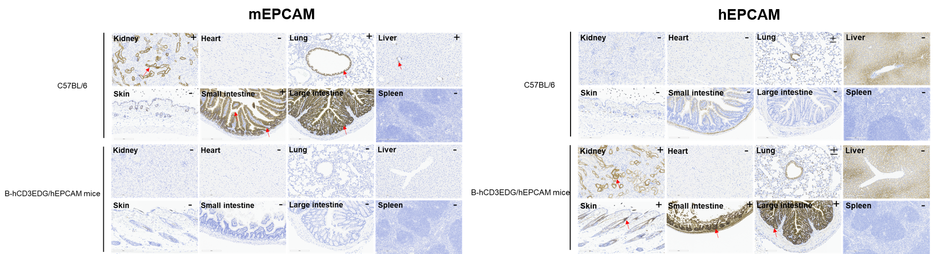 Immunohistochemical (IHC) analysis of EPCAM expression in B-hCD3EDG/hEPCAM mice. The kidney, heart, lung, liver, skin, small intestine, large intestine and spleen were collected from wild-type C57BL/6 mice and B-hCD3EDG/hEPCAM mice (female, 6-week-old), analyzed by IHC with anti-EPCAM antibody (anti-mEPCAM: abcam, ab213501; anti-hEPCAM: abcam, ab223582). Mouse EPCAM was detectable in C57BL/6 mice. Human EPCAM was detectable in B-hCD3EDG/hEPCAM mice. The arrow   indicates tissue cells with positive EPCAM staining (brown). “+” indicates that the tissue is positive, and “-” indicates that the tissue is negative. The antibody ab223582 exhibited strong non-specific binding in the small intestine and liver, with no obvious membrane staining signals observed in the bronchial epithelial cells of the lung.