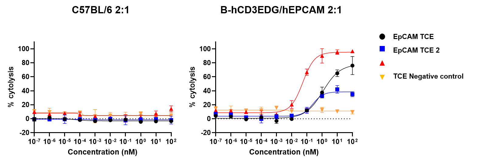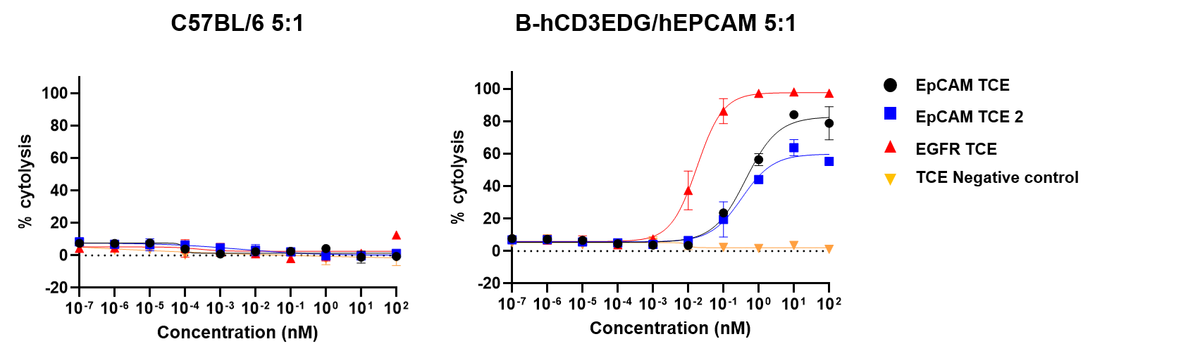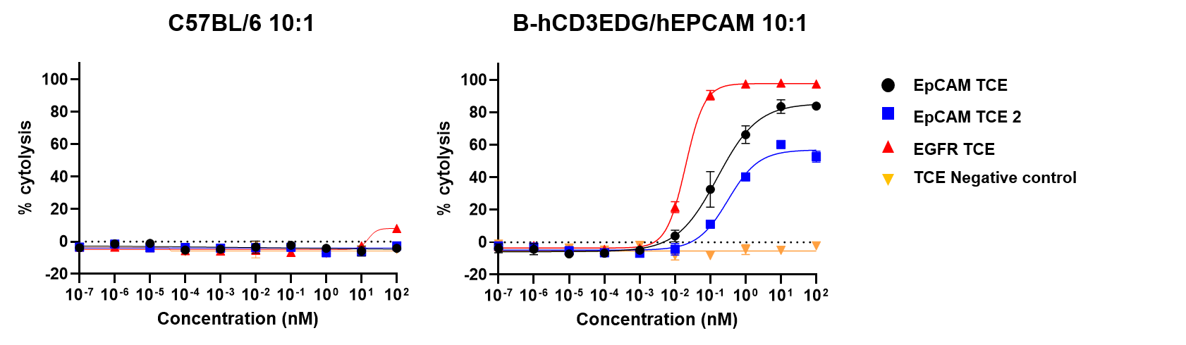 • TDCC: CD3+ T cells from the spleens of B-hCD3EDG/hEPCAM mice respond to human-specific T-cell engagers, leading to efficient killing of human EpCAM-expressing cancer cells.