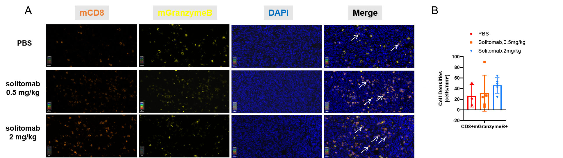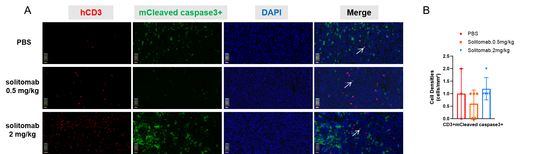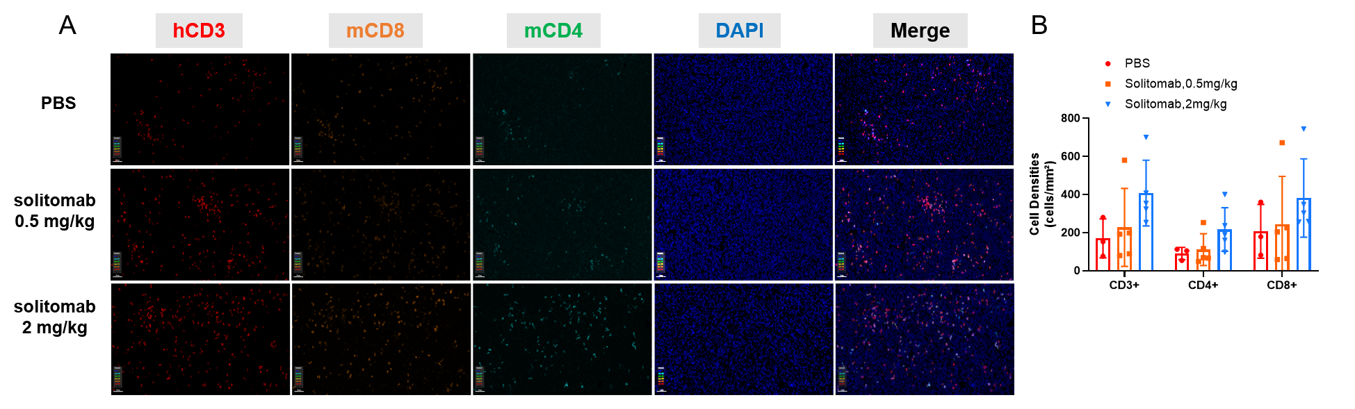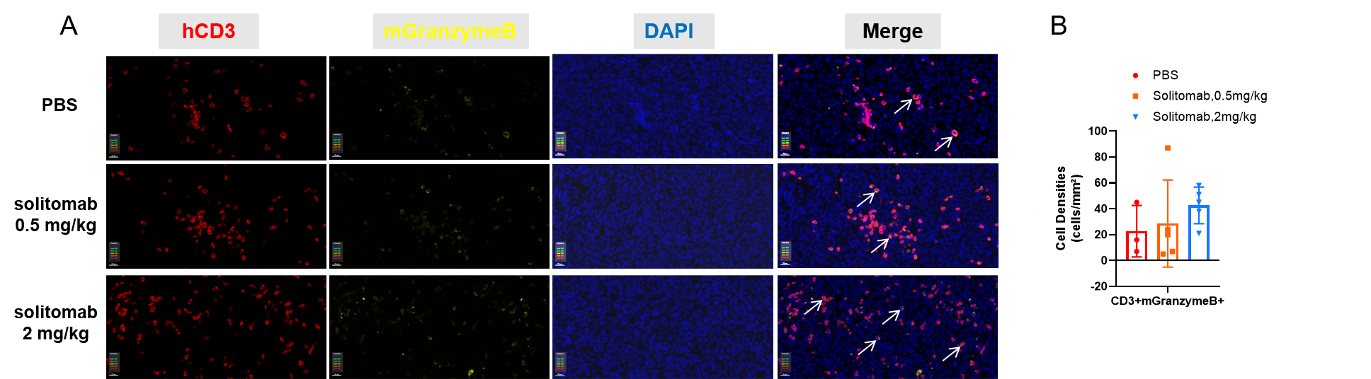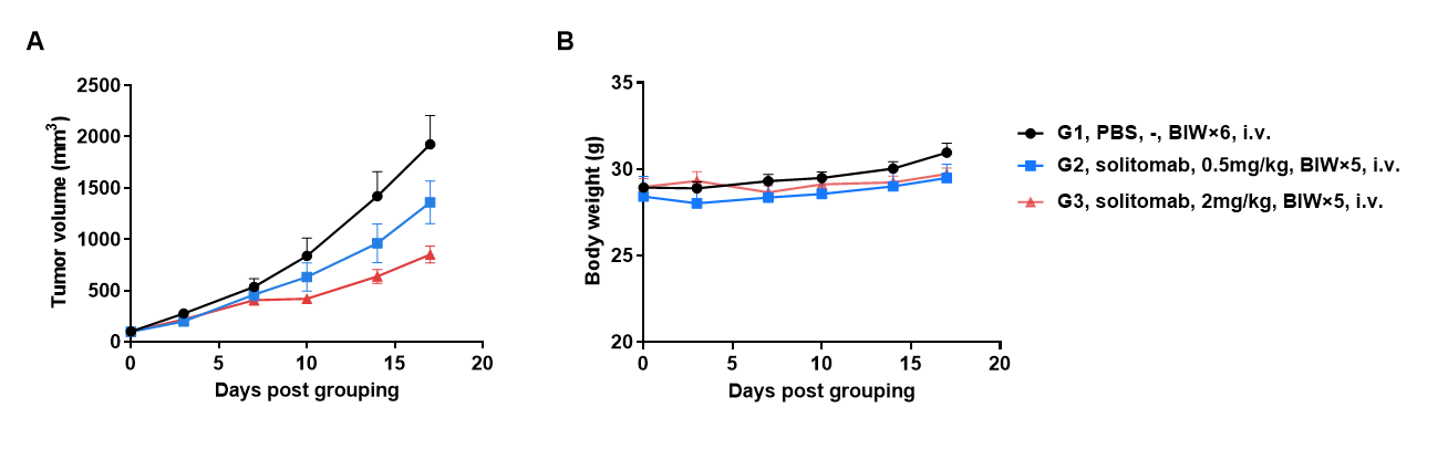 • In vivo studies demonstrated that solitomab effectively inhibited B-hEPCAM MC38 tumor growth in B-hCD3EDG/hEPCAM mice.