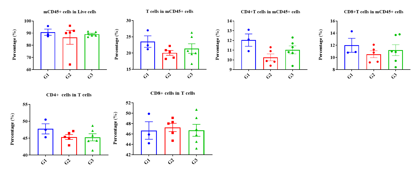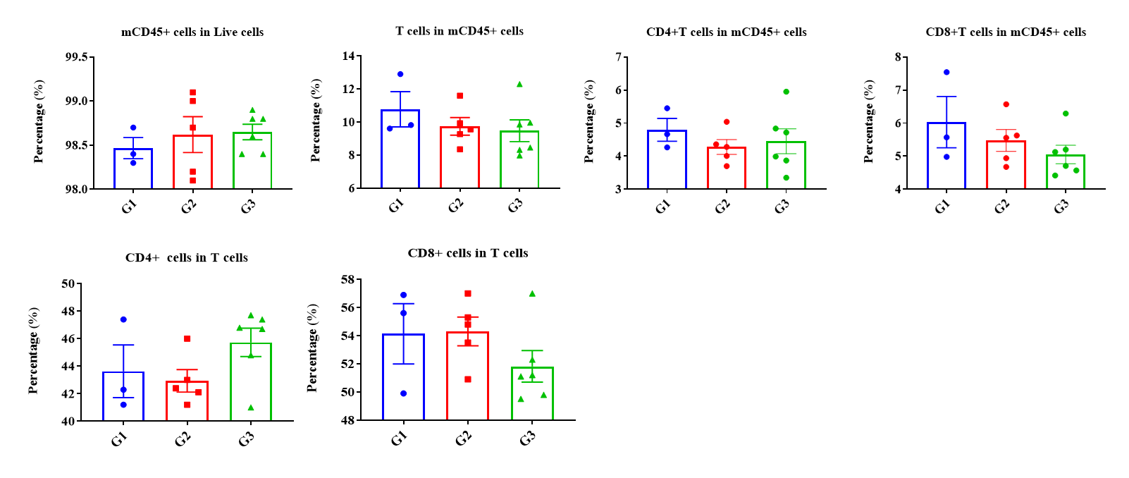 • Humanization of CD3EDG and EPCAM does not change the overall frequency or distribution of immune cell types in spleen, blood, and lymph nodes.