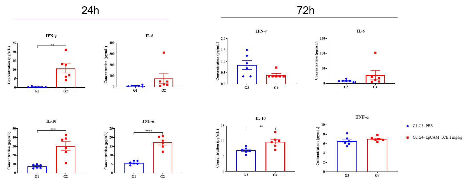 An EPCAM TCE induced cytokine release in B-hCD3E/hEPCAM mice. B-hCD3E/hEPCAM mice (female, n=6) received a single intravenous administration of the antibody on day 0. Serum cytokine levels were measured using Meso Scale Discovery (MSD) assay at 24 and 72 hours post-dosing. Data are presented as mean ± SEM. Statistical significance was determined by unpaired T-test (*P < 0.05, ​​**P < 0.01, ***​​P < 0.001, ****P<0.0001). This study was conducted in collaboration with the client.
