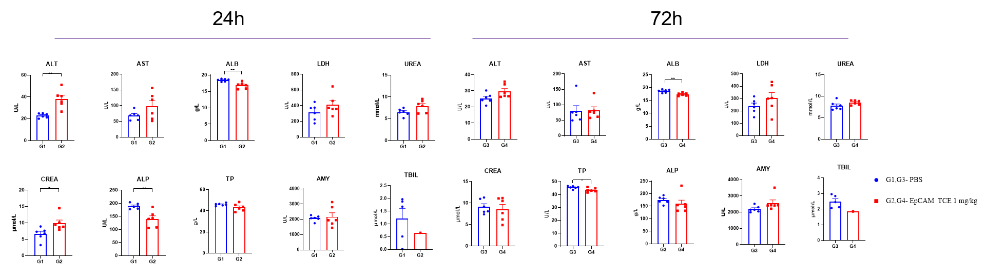 Clinical chemistry analysis of an EPCAM TCE was performed in B-hCD3E/hEPCAM mice. Animals received a single intravenous administration of the antibody (red) on day 0. Blood samples were collected for biochemical analysis. Data are presented as mean±SEM. Statistical significance was assessed by unpaired T-test (*p < 0.05, ​*​*p < 0.01). This study was conducted in collaboration with the client.