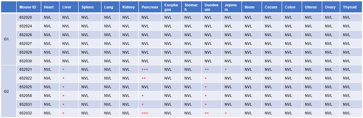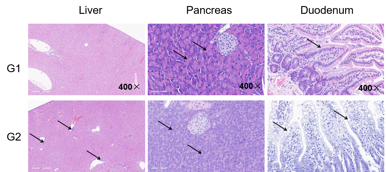 Inflammatory cells infiltration (minimal, 6/6) in liver and reduced secretion in pancreas exocrine glands (5/6, minimal 2/5; slight 1/5; moderate 2/5) indicative of drug-induced changes were observed. Duodenum (6/6, minimal 4/6; slight 2/6) and jejunum (minimal, 2/6) were also noted which were considered to be secondary changes resulting from insufficient secretion of the pancreas. There were no other significant lesions in G1 mice and other organs from G2 mice in microscopic observation. This study was conducted in collaboration with the client.