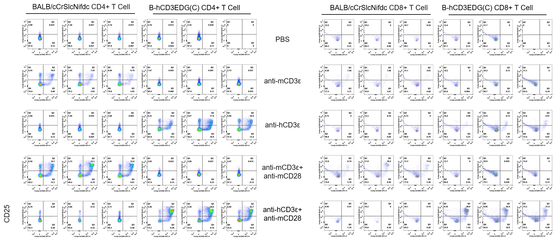 CD25 and CD69 expression analysis in wild-type BALB/cCrSlcNifdc mice and homozygous humanized B-hCD3EDG mice(C) by flow cytometry. T cells were isolated from splenocytes of BALB/cCrSlcNifdc and B-hCD3EDG mice(C) (n=3, 6-week-old), and were incubated in the presence of anti-mCD3ε antibody (2ug/ml,BioXcell,BE0001-2) , anti-hCD3ε antibody (2ug/ml,BioXcell,BE0001-1) and anti-mCD28 antibody (5ug/ml,BioXcell,BE0015-1) for 48h. T cell proliferation was tested by flow cytometry. T cell activation in B-hCD3EDG mice(C)  was significantly up-regulated by anti-hCD3ε antibody or anti-hCD3ε antibody and anti-mCD28 antibody.