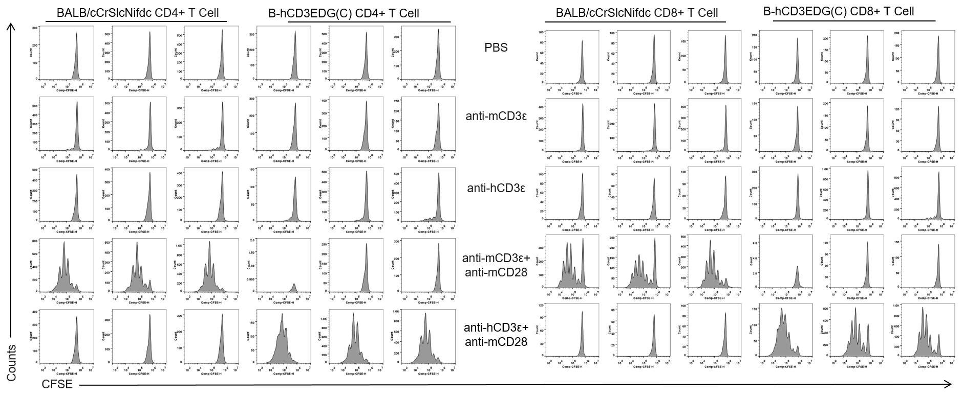 The proliferation of CD4+T cells and CD8+T cells was analyzed by flow cytometry. T cells were isolated from splenocytes of BALB/cCrSlcNifdc and B-hCD3EDG mice(C) (n=3, 6-week-old), and were incubated in the presence of anti-mCD3ε antibody(2ug/ml,BioXcell,BE0001-2) , anti-hCD3ε antibody (2ug/ml,BioXcell,BE0001-1) and anti-mCD28 antibody (5ug/ml,BioXcell,BE0015-1) for 72h. T cell proliferation was tested by flow cytometry. T cell activation in B-hCD3EDG mice(C) was significantly up-regulated by anti-hCD3ε antibody and anti-mCD28 antibody.