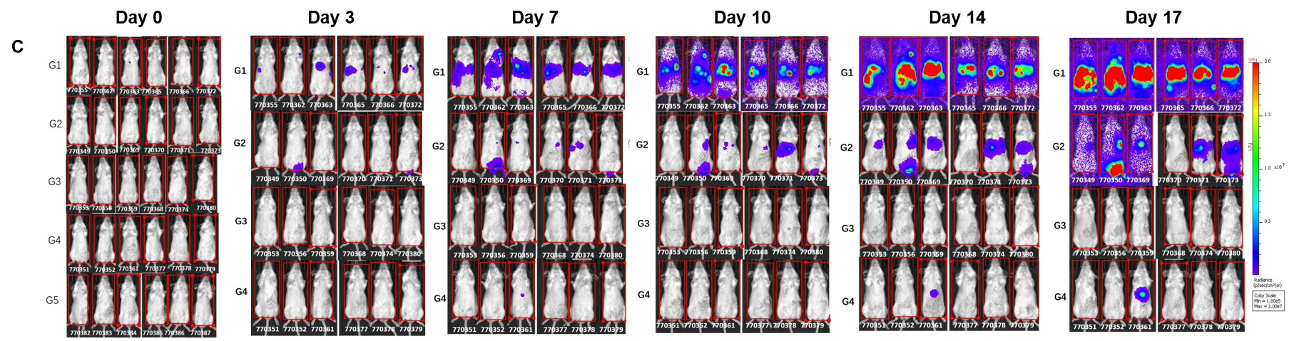 Antitumor activity of anti-human CD3×CD19 bispecific antibody (TNB-486 analog) in B-hCD3EDG mice(C). B-hCD19-luc-GFP A20 cells were injected intravenously into B-hCD3EDG mice(C) (female, 9-week-old, n=6). Mice were randomized for treatment when the average bioluminescence signal reached ~10⁶ p/s. The BsAb or PBS was administered intravenously per the dosing scheme. Tumor burden (via bioluminescence imaging) and body weight were monitored twice weekly. (C) Raw bioluminescence images. These results indicate that the B-hCD3EDG mice(C) provide a powerful preclinical model for in vivo evaluation of CD3-based antibodies. Values are expressed as mean ± SEM.