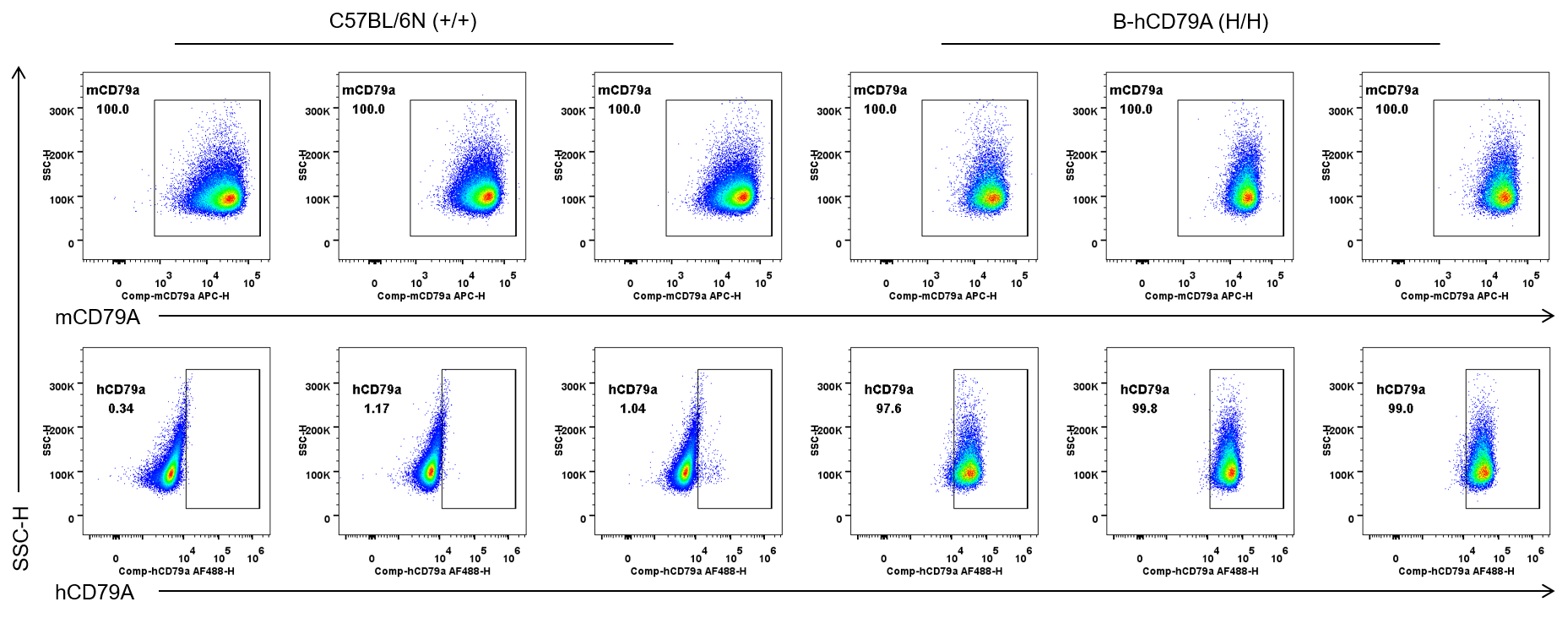 Strain specific CD79A expression analysis in wild-type C57BL/6N mice and homozygous humanized B-hCD79A mice by flow cytometry. Spleen was collected from wild-type C57BL/6N mice (+/+) (male, 8-week-old) and homozygous B-hCD79A mice (H/H) (male, 8-week-old). Protein expression in B cells was analyzed with anti-mouse CD79A antibody (Biolegend, 133105) and anti-human CD79A antibody (RD, FAB69201G) by flow cytometry. The anti-mouse CD79A antibody recognized both wild-type mice and humanized mice because its recognition sites were the intracellular region, which was not replaced in the humanized mice. Human CD79A was exclusively in homozygous B-hCD79A mice but not in wild-type C57BL/6N mice .