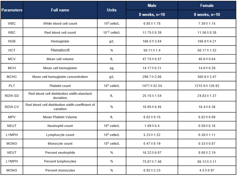 Complete blood count (CBC) of C57BL/6JNifdc mice. Values are expressed as mean ± SD.