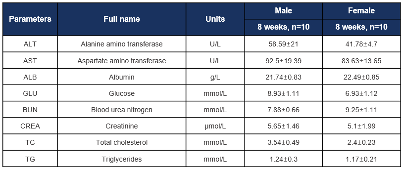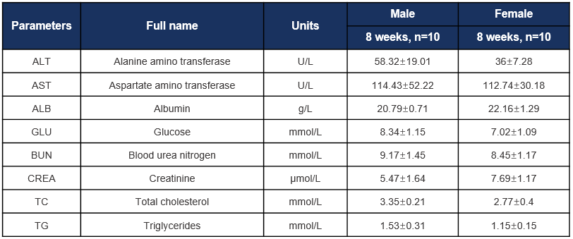 Biochemical test of C57BL/6JNifdc mice. Values are expressed as mean ± SD.
