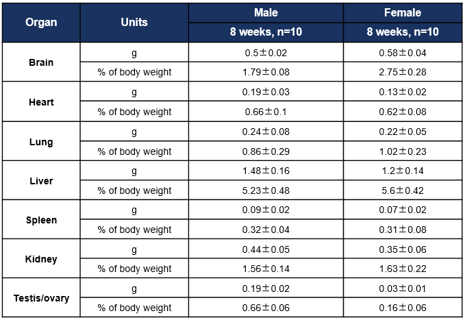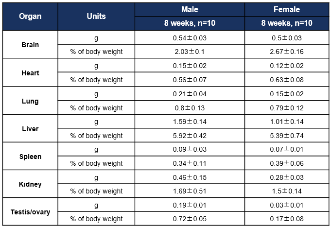 Average weight of the main organs of C57BL/6JNifdc mice. Values are expressed as mean ± SD.