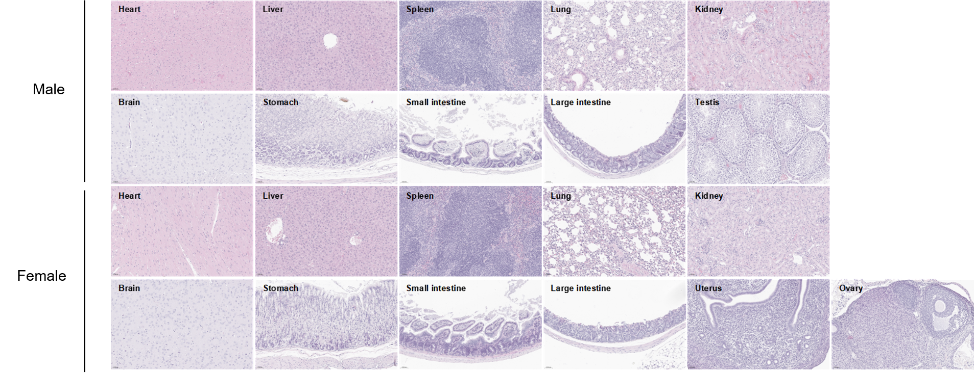 Histopathological analysis of organs in C57BL/6JNifdc mice. The main organs of C57BL/6JNifdc mice were isolated at 8 weeks of age and analyzed with H&E staining (male, n=10; female, n=10). Results showed that no obvious abnormalities were found in all of the organs (heart, liver, spleen, lung, kidney, brain, stomach, small intestine, large intestine, ovary, uterus and testis). Scale bar: 50 μm.