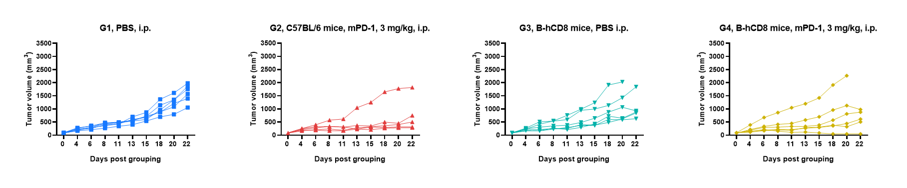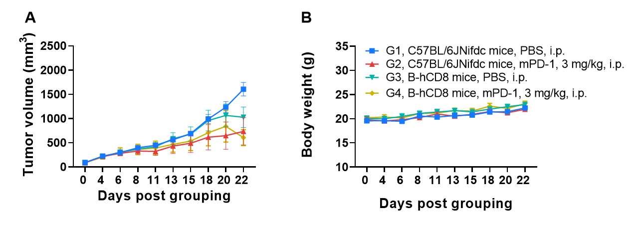 Comparison of anti-PD-1 antibody efficacy between C57BL/6JNifdc mice and B-hCD8 mice. (A) Effect of anti-mouse PD-1 antibody on MC38 tumor growth in C57BL/6JNifdc mice and B-hCD8 mice. Treatment with PBS or anti-mouse PD-1 antibody when tumor volume reached approximately 100 mm3. As shown in panel A, anti-mPD-1 antibody treatment exhibited stronger inhibitory efficacy in both C57BL/6JNifdc mice and B-hCD8 mice. (B) Body weight changes during tumor growth observation. These results demonstrate that B-hCD8 mice exhibited anti-tumor efficacy comparable to wild-type C57BL/6JNifdc mice, confirming its functional competence in mediating tumor cell killing. Values are expressed as mean ± SEM.