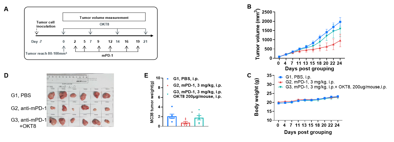 The impact of CD8 + T cell depletion on the efficacy of anti-mouse PD-1 antibody (A) Experimental scheme. (B) Effect of anti-mouse PD-1 antibody on MC38 tumor growth in B-hCD8 mice, with or without CD8+ T cell depletion. (C) Body weight changes during tumor growth observation. (D-E) MC38 tumor weight measurement after the mice were sacrificed. B-hCD8 mice received a subcutaneous flank injection of 5×105 MC38 cells. Treatment with anti-mouse PD-1 antibody or the CD8+ T cell-depleting antibody OKT8 was initiated when tumor volume reached approximately 100 mm3, following the regimen detailed in the pane A. As shown in panel B, anti-mPD-1 antibody treatment exhibited stronger inhibitory efficacy than CD8+ T cell depletion, demonstrating the critical tumor-killing function of CD8+ T cells in B-hCD8 mice. These results validate the B-hCD8 mice as a powerful preclinical model for in vivo assessment of anti-tumor efficacy in the context of a humanized CD8+ T cell compartment. Values are expressed as mean ± SEM.