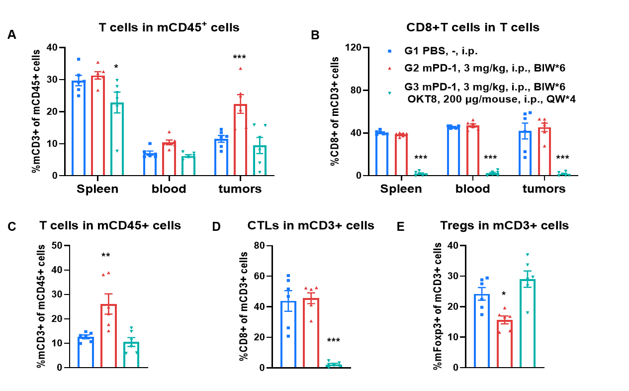 The impact of CD8 + T cell depletion on the efficacy of anti-mouse PD-1 antibody. (A-B) Demonstration of CD8+ T cell depletion by flow cytometry. Depletion was performed by OKT8 administration once per week (200 μg/mouse) starting 2 days prior to start of treatments. There was a significant decreasing of CD3+ T cells in the spleen, whereas no significance was observed in the blood and tumors for the combination of anti-mPD-1 antibody and OKT8 (A). Demonstration of near complete CD8+ T cell depletion in spleen, blood and tumor on day 24 from last OKT8 administration in combination of anti-mPD-1 antibody and OKT8 (B). (C-E) Tumors from MC38 tumor-bearing mice that were treatmented with the PBS, anti-mPD-1, and combination of anti-mPD-1 antibody and OKT8 were analyzed on day 24. Analysis of CD3+ T, CD8+ T and Tregs in the tumors determined by the flow cytometric assay. For tumor-infiltrated T (C) and Tregs (E), the percentages (in CD45+ cells) were not significantly changed, tumor-infiltrated CD8+ T cells was decreased significantly in combination of anti-mPD-1 antibody and OKT8 (D).