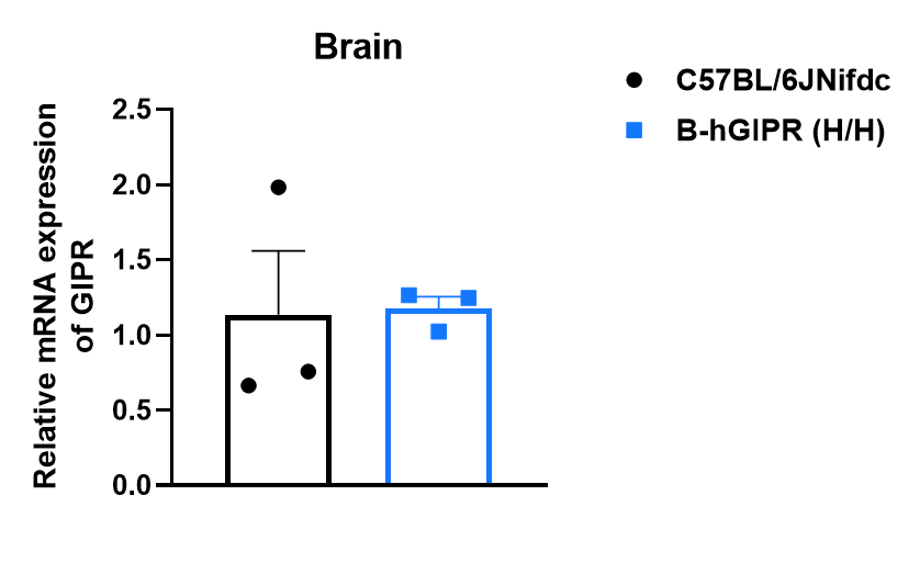 Strain specific analysis of GIPR mRNA expression in wild-type C57BL/6JNifdc and B-hGIPR mice by RT-qPCR. RNA was isolated from wild-type C57BL/6JNifdc (+/+) and homozygous B-hGIPR mice (H/H), then cDNA libraries were synthesized by reverse transcription, followed by PCR with GIPR primers. Values are expressed as mean ± SEM. (The primer was designed at 5’UTR, so it can amplify both mouse and human GIPR mRNA.)