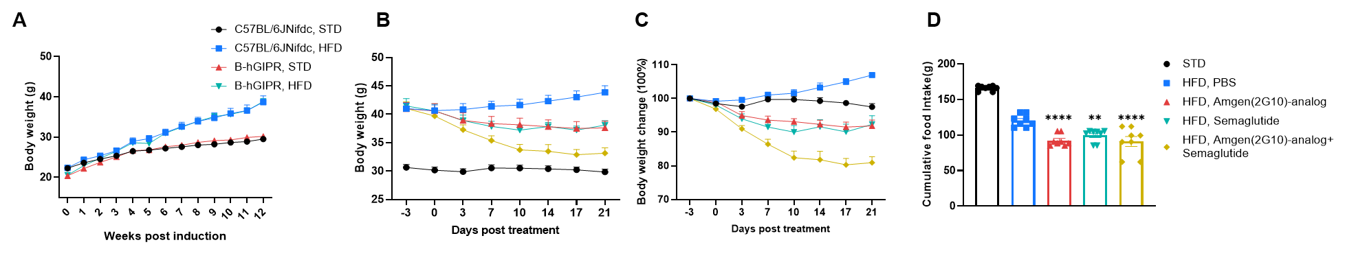 Efficacy study in HFD induced B-hGIPR mice. B-hGIPR mice were fed with a high-fat diet for 12 weeks to induce mice obesity. (A) Body weight change after HFD induction. (B-C) Body weight change after hGIPR-antibody Amgen (2G10) analog (in house), Semaglutide, and combination treatment. (D) Effect of hGIPR-antibody Amgen (2G10), Semaglutide, and combination treatment on food intake on Day 21. 8 mice per group. Values are expressed as mean ± SEM. Significance was determined by the Ordinary one-way ANOVA compared with HFD PBS group. *p<0.05, **p<0.01,***p<0.001 ,****p<0.0001.