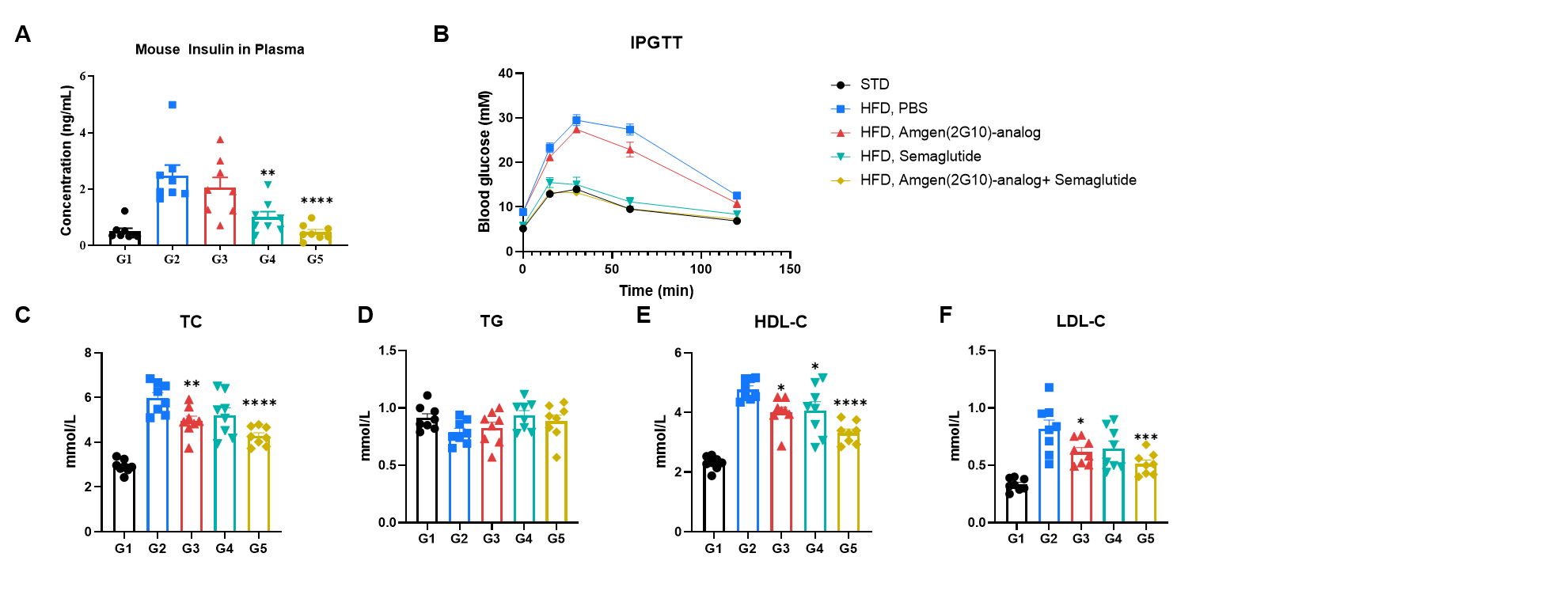 Efficacy study in HFD induced B-hGIPR mice. (A) Fasting insulin after treatment in plasma after 6 hours of fasting. (B) After fasting for 6 hours, mice were intraperitoneally injected with 15% Glucose (1.5 g/kg) for Glucose Tolerance Tests after treatment. (C-F) Blood biochemical analysis after treatment. Values are expressed as mean ± SEM. Significance was determined by the Ordinary one-way ANOVA compared with HFD PBS group. *p<0.05, **p<0.01,***p<0.001 ,****p<0.0001.