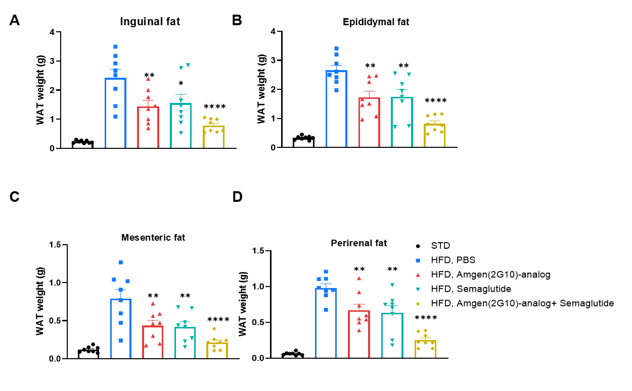 Efficacy study in HFD induced B-hGIPR mice. (A-D) Weight of white adipose tissue at the end of the treatment. Values are expressed as mean ± SEM. Significance was determined by the Ordinary one-way ANOVA compared with HFD PBS group. . *p<0.05, **p<0.01,***p<0.001 ,****p<0.0001.
