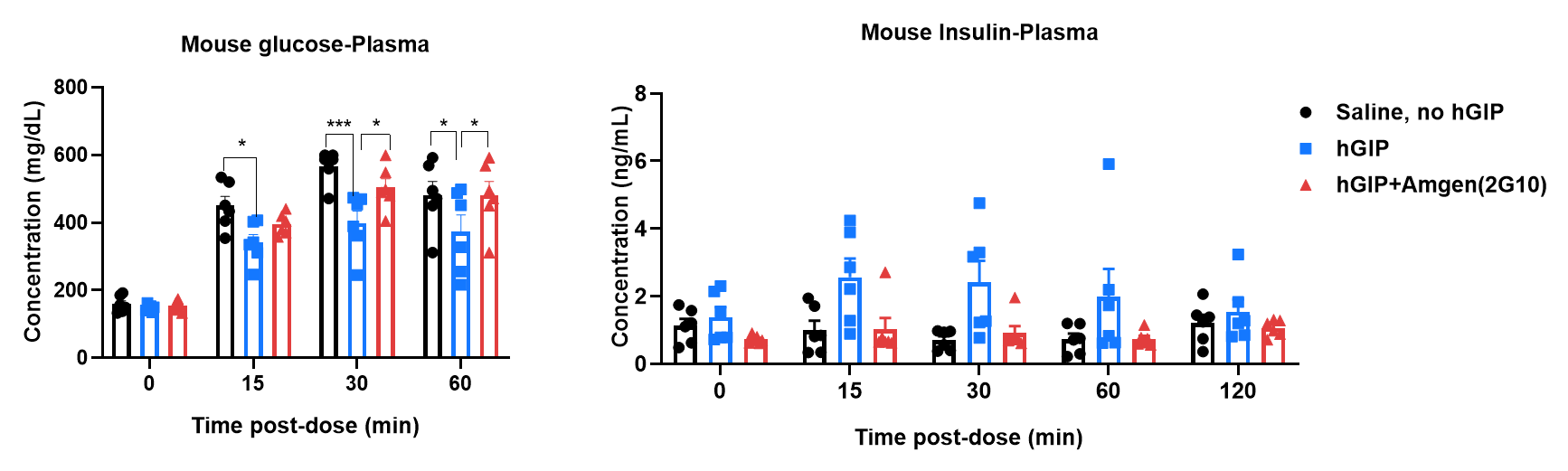 Biocytogen developed a GIPR humanized mice, the full coding sequences of human GIPR gene plus 3’UTR was inserted into the mouse Gipr in-situ. Then, confirmed that human GIPR mRNA was detectable only in homozygous B-hGIPR mice but not in wild-type mice. GIPR protein was detected in brain, stomach, pancreas and liver of homozygous B-hGIPR mice. During the IGPTT, human GIP induced the plasma insulin secretion and inhibit the glucose secretion.