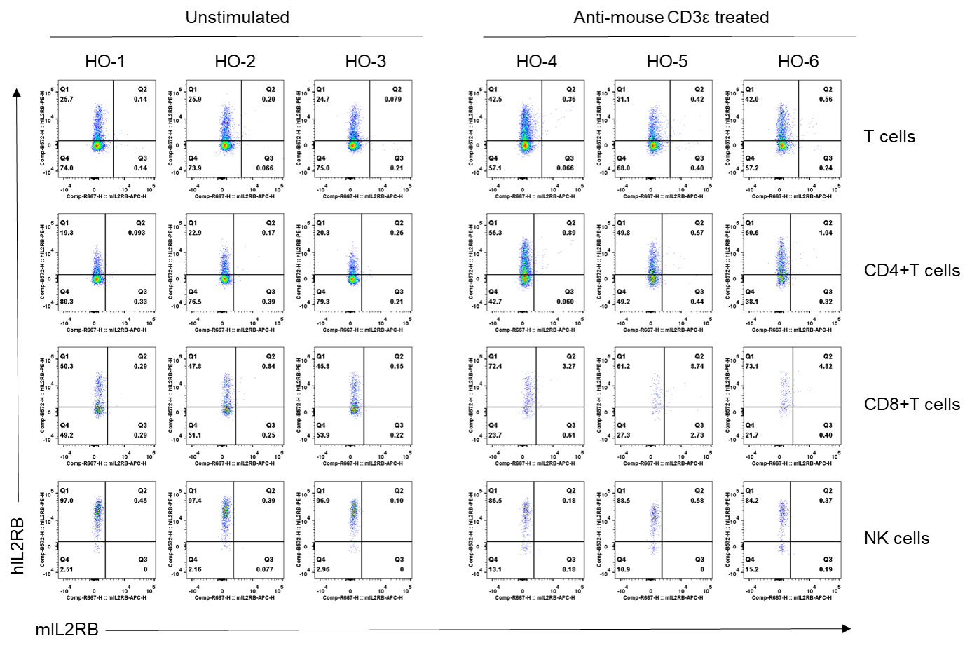 Strain specific IL2RB expression analysis in homozygous (HO) B-hIL2RB/hIL2RG/hIL15/hIL15RA/hNKG2D plus mice by flow cytometry. Splenocytes were collected from homozygous B-hIL2RB/hIL2RG/hIL15/hIL15RA/hNKG2D plus mice (female, 7-week-old, n=3/group) stimulated with or without anti-mouseCD3ε antibody (7.5 μg/mice, i.p.) in vivo for 24 h,  and analyzed by flow cytometry with species-specific anti-mouse IL2RB antibody (Biolegend, 105912) and anti-human IL2RB antibody (Biolegend, 339005). Human IL2RB was only detectable in homozygous B-hIL2RB/hIL2RG/hIL15/hIL15RA/hNKG2D plus mice.