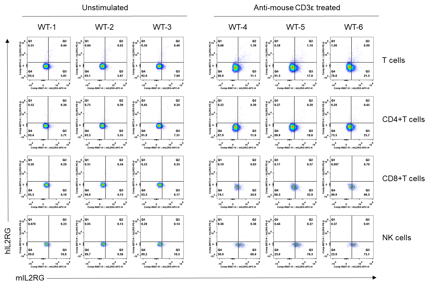 Strain specific IL2RG expression analysis in homozygous (HO) B-hIL2RB/hIL2RG/hIL15/hIL15RA/hNKG2D plus Mice by flow cytometry. Splenocytes were collected from homozygous B-hIL2RB/hIL2RG/hIL15/hIL15RA/hNKG2D plus mice (female, 7-week-old, n=3/group) stimulated with or without anti-mouse CD3ε antibody (7.5 μg/mice, i.p.) in vivo for 24 h,  and analyzed by flow cytometry with species-specific anti-mouse IL2RG antibody (Biolegend, 132307) and anti-human IL2RG antibody (Biolegend, 338605). Human IL2RG was only detectable in homozygous B-hIL2RB/hIL2RG/hIL15/hIL15RA/hNKG2D plus mice.
