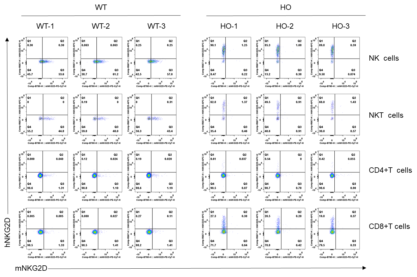 Strain specific NKG2D expression analysis in homozygous (HO) B-hIL2RB/hIL2RG/hIL15/hIL15RA/hNKG2D plus mice by flow cytometry. Splenocytes were collected from wild-type (WT) C57BL/6JNifdc mice and homozygous B-hIL2RB/hIL2RG/hIL15/hIL15RA/hNKG2D plus mice (female, 7-week-old, n=3/group),  and analyzed by flow cytometry with species-specific anti-mouse NKG2D antibody (eBioscience, 2298692) and anti-human NKG2D antibody (Biolegend, 320807). Human NKG2D was only detectable in homozygous B-hIL2RB/hIL2RG/hIL15/hIL15RA/hNKG2D plus mice.