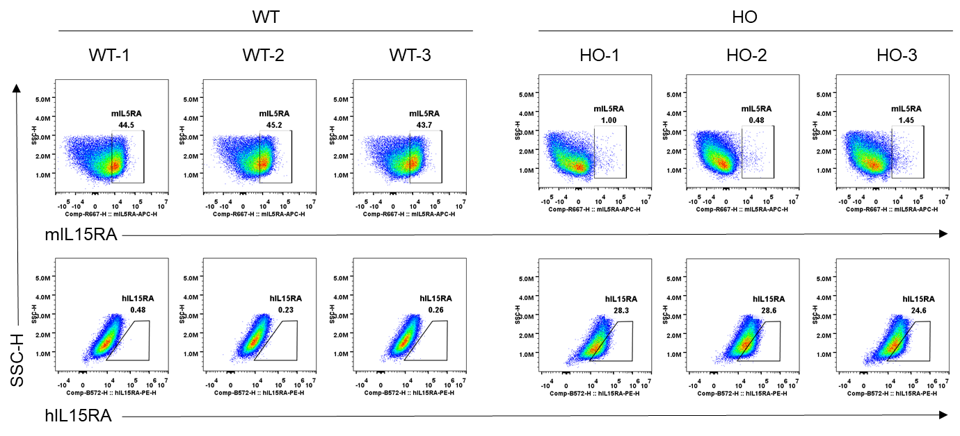 Strain specific IL15RA expression analysis in homozygous B-hIL2RB/hIL2RG/hIL15/hIL15RA/hNKG2D plus mice by flow cytometry. Bone marrow cells were collected from wild-type (WT) C57BL/6JNifdc mice and homozygous (HO) B-hIL2RB/hIL2RG/hIL15/hIL15RA/hNKG2D plus mice, and cultured in 6-well plates stimulated with GM-CSF and IL-4 for 6 days and LPS (1 μg/mL) for 18 h to induce BMDCs. Then BMDCs were collected and analyzed by flow cytometry with anti-mIL15RA antibody (BD, 568235) and anti-hIL15RA antibody (Biolegend, 330207). The mIL15RA was only detectable in wild-type mice. The mIL15RA was exclusively detectable in homozygous mice.