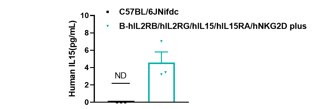 Strain specific IL15 expression analysis in wild-type C57BL/6JNifdc mice and homozygous B-hIL2RB/hIL2RG/hIL15/hIL15RA/hNKG2D plus mice by ELISA. Serum was collected from wild-type C57BL/6JNifdc mice and homozygous B-hIL2RB/hIL2RG/hIL15/hIL15RA/hNKG2D plus mice (female, 7-week-old, n=3/group) stimulated with 350mg/kg APAP in vivo for 18 hrs. Expression level of human IL15 was analyzed by ELISA (anti-human IL15 ELISA kit: R&D D1500). Human IL15 was exclusively detectable in homozygousB-hIL2RB/hIL2RG/hIL15/hIL15RA/hNKG2D plus mice. Values are expressed as mean ± SEM.